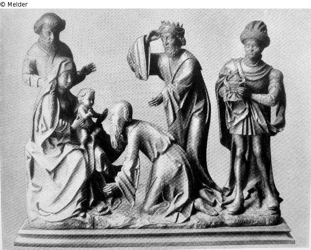 To the left of Joseph, who is standing, sits Mary with the child, with a king kneeling at her side; the other two figures are standing on the right, the Moor holding a vessel wrapped in a cloth. Minor additions, the child's right arm is broken off. Illustration from auction catalogue, plate 38.
