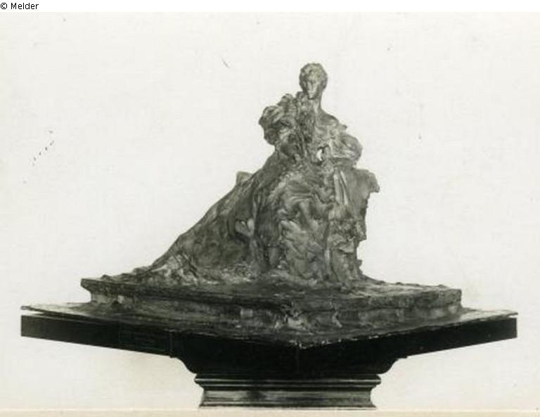 Sitting on a base of indeterminate shape, the left side rebelled a lady in ball dress with a long train, a feather boa located on the right shoulder.