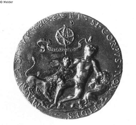 Runde Plakette. Ein nackter Jüngling wird von drei Löwen angefallen. Über ihm schwebt ein Astrolabium, an dessen Schaft ein fliegendes Band mit der Inschrift AM / ANDO IO befestigt ist. Die Umschrift lautet: ET ? SI ? CORPVS ? NON ? FIDES ? MACVLABITVR, dazwischen ist eine Ranke eingefügt. Das Exemplar in der Kress Collection in Washington trägt auf der Mitte der Rückseite ein Monogramm aus C, M, A und R, umrahmt von einem Fries mit Tritonen und Nereiden. Auf anderen Exemplaren fehlt die Umschrift und die Kugel wurde durch verschlungene Hände und ein Spruchband mit ANCI ? MORTE ? CHE ? ROMPE ? FEDE ? ersetzt. Pope-Hennessy vermerkte Analogien zum Stil des Meisters IO.F.F.