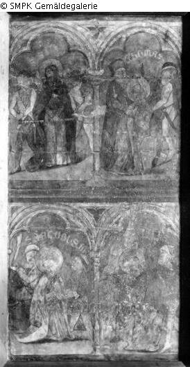 Panel painting: Retable: the group of the following saints (Virgines Capitales) depicted together: Barbara, Catherine of Alexandria, Margaret, later also Dorothea : Margaret of Antioch, virgin martyr; possible attributes: Cross, crown, dragon (under the feet or in chains), pearl (necklace) & the group of the following saints (Virgines Capitales) depicted together: Barbara, Catherine of Alexandria, Margaret, later also Dorothea : Dorothea of Caesarea, virgin martyr; possible attributes: Basket of roses and apples, child with basket of roses, garland of roses, roses in hand or lap & canopy; Quattour Virgines Capitales; Virgines Capitales; Barbara (saint); Catherine de Alexandria (saint); Margaret (saint); Dorothea (saint); four; Virgin : Margaret (saint); Dragon; Chain; Pearl; Cross; Crown & Quattour Virgines Capitales; Virgines Capitales; Barbara (saint); Catherine de Alexandria (saint); Margaret (saint); Dorothea (saint); four; Virgin : Dorothea (saint); Basket; Rose; Apple; Child; Garland & Canopy