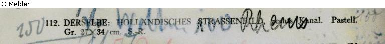 Collection Eduard Fuchs, Berlin-Zehlendorf at the latest 1912 to 1933; 25.10.1933 confiscation by the Gestapo; forced sale (payment of Reichsfluchtsteuer) 1937 by his daughter Gertraud Fuchs: Auction Rudolph Lepke, Catalogue 2114, 16. and 17.06.1937, No. 112 ("Holländisches Straßenbild, rechts Kanal, Pastell. Gr. 27 x 34 cm, Silberrahmen"); auctioned there by the art dealer Victor Rheins (Unter den Linden 68, Berlin) according to the annotated catalogue of the RKD Den Haag (Dutch Institute for Art History) for 100 RM (estimated price 150 RM); whereabouts unknown