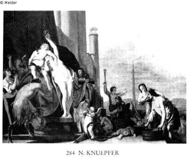auf einer Terrasse. Auf dem Weinfass vor grünem Vorhang, sitzt Bacchus, eine nackte Frau liebkosend. Ein Satyr zapft Wein; rechts Putten und zwei Männer bei Wein und Gesang. Blick auf weite Landschaft; Abb.: Répertoire des biens Spoliés en France, Nr. 284