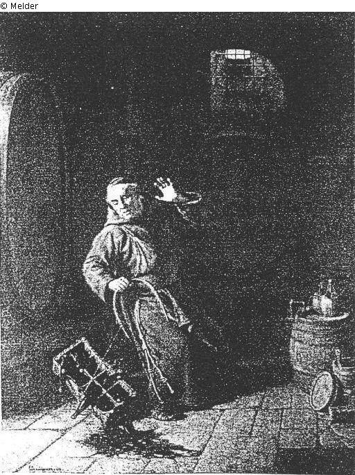 a Franciscan monk is torn by the rope of a carrying basket with red wine bottles, which smash on the stone floor of the cellar; signed and dated: 08