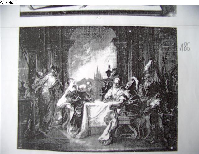 Auf einer Terasse mit Ausblick auf Park und Gebäude sitzen Nabal, sein Weib Abigail und ein Mann in Rüstung beim Mahle. Zu beiden Seiten des Tisches Bedienstete, Dienerinnen und ein Mohrenknabe. Lichte bräunliche, rote, blaue und gelbe Töne; Abb.: Répertoire des biens Spoliés en France, Nr. 370