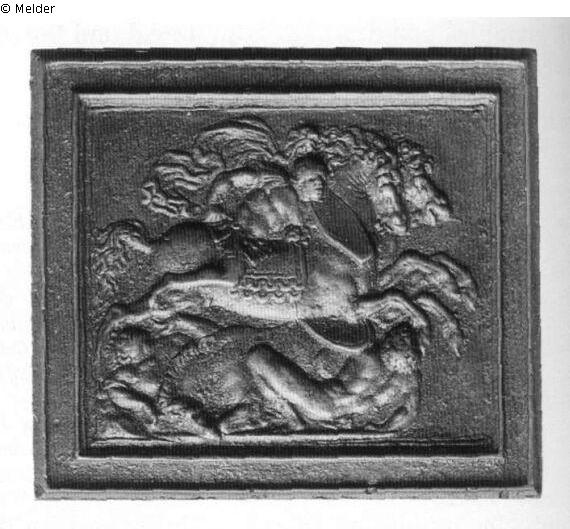 Rechteckige Plakette, ringsum breiter profilierter Rahmen. Ein Reiter mit Helm, Panzerrock, Schild und wehendem Mantel sprengt nach rechts. Unter dem Pferd liegt ein gestürzter Reiter, der den Schild abwehrend erhoben hält. Links erblickt man einen anderen Gestürzten, hinten ein weiteres Pferd. Die Plakette stimmt in Rahmen und Größe mit Nr. 101 ("Herkules und der nemeische Löwe") überein, sie waren offenbar für eine Verwendung an einem Kästchen vorgesehen. Die Szene erscheint oft auf einer runden Plakette mit der Inschrift DVBIA FORTV · NA (Molinier 1886, Nr. 215; Pope-Hennessy 1965, Nr. 186). Die beiden letzten Buchstaben sind ligiert, Molinier sah in ihnen in doppelter Bedeutung auch das Monogramm Modernos. Spätere Bearbeiter gaben sie meist einem Meister im Stil des Moderno. Eine Kamee nach antiken Motiven von ca. 1504 in der ehemaligen Slg. Orléans zeigt ähnlich aufgefaßte Figuren. Einige Details stimmen mit der Reiterschlacht-Plakette (Bange 1922, Nr. 371) des Riccio überein. Die Szene war auch ein beliebtes Motiv für Schwertknäufe, die sich mit verschiedenen Rückseiten in mehreren Sammlungen erhalten haben: Berliner Museen (Bange 1922, Nr. 515, Rs.: Weiblicher Profilkopf in Rankenfries); Victoria and Albert Museum in London (Maclagan 1924, S. 39, Rs.: Mucius Scaevola des Meisters IO.F.F.); Museo Nazionale del Bargello Florenz (Rs.: Die Badenden des Bramante). In der Berliner Skulpturensammlung findet sich der Knauf auch in willkürlicher Montierung mit der Statue einer schreitenden Sphinx (Goldschmidt 1914, Nr. 78). Sie wurde für die Rückseiten späterer Medaillen, so z. B. der Francesco-Sforza-Medaille von Pietro Paolo Galeotti (Armand I 1883, S. 234, Nr. 36) verwendet.