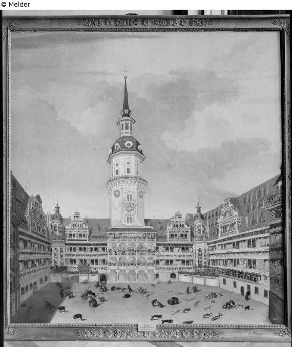 Listed in the Gardemeuble inventory of paintings; Listed in inventory no. 1 of 31 January 1920 as part of the 1924 settlement agreement between the Free State of Saxony and the former royal house; On the salvage list of art objects of particular value, drawn up by the head of the revenue office office, Hugo Bahr, and the palace administrator Johannes Bibrach on 6 May 1942, ‘6 paintings’ are mentioned in the ‘Canaletto Room’(Cap. VI. 66.). The painting ‘Bärenhatz im Schloßhofe zu Dresden’ was initially brought to Pillnitz Castle along with 60 other paintings from the command rooms. From there, on 7 December 1943, it was taken to the relocation site, the manor house of the Rehnsdorf estate (now part of the town of Elstra in the district of Bautzen). In consideration of the situation, Gauleiter Martin Mutschmann ordered on 19 January 1945 that all relocation sites east of the Elbe be cleared and the salvage transferred to depots west of the Elbe. This also included the salvage from the Rehnsdorf manor. The transport of 61 paintings from Rehnsdorf to Schieritz Castle took place on 26 March 1945; according to the records, they were lost at the removal site.