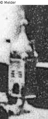 The besamim box is designed in the common shape of a tower and, according to the information on the back of the photo, is made of silver.
