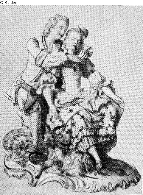 auf rocaillengeschmücktem Sockel sitzt der Schäfer, vor ihm, an seine Brust gelehnt, die Schäferin, im Munde die Flöte, die ihr mit beiden Händen der Schäfer hält. Zu den Füßen ein Ziegenbock. Bunte Bemalung: Weiße Rokokokostüme mit blauen Kantenund blauem Streublütenmuster. Der Grassockel von goldstaffierten Rocaillen eingefaßt. Kleine Reparatur. Modell von Johs. Fried. Lück nach Bouchers "L'agréable lecon".