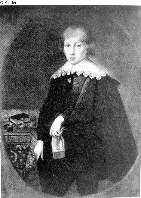 Bildnis eines dreizehn Jahre alten Edelknaben, in gemaltem Oval vor brauner Wand neben einem Tisch mit kleinasiatischem Knüpfteppich stehend, in schwarzer Pelerine über schwarzem Rock mit weißem Spitzenkragen, mit blondem, halblangem Haar. Bezeichnet rechts: Anno 1637/Aetatis suae 13; Gutachten Hoofstede de Groot ; Literatur: Abbildung Versteigerungskatalog Tafel 23