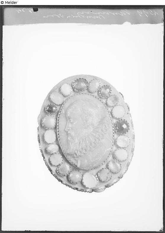 Oval silver box set with colourful paste and stones; oval amber relief on the lid: bust of duke John Casimir of Saxe-Coburg (?).