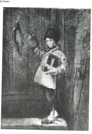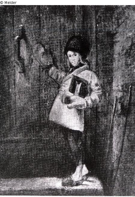 Peasant boy going to school with thick gloves and wooden slippers, standing in front of a door.
