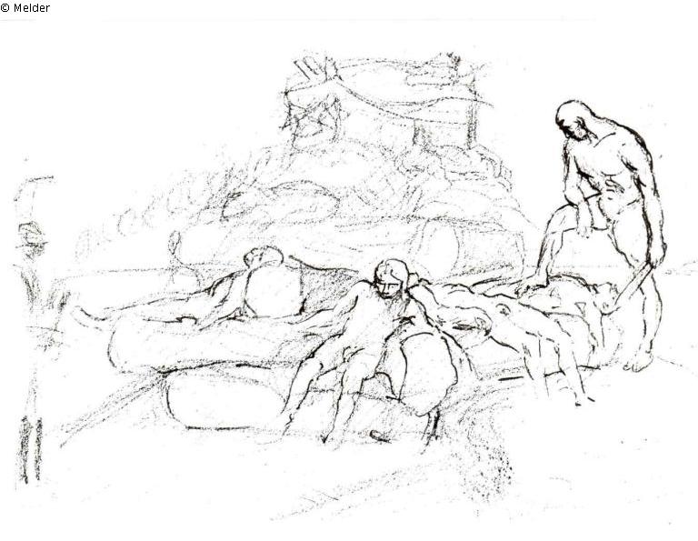 „Patroklos war nach einer Intervention des Gottes Apollo vor den Mauern Trojas von Hektor getötet worden. Seine letzten Worte an seinen Rivalen waren: ‚Frohlocke nicht allzu laut, bald wirst du, von Achill gefällt, wie ich hier im Staube liegen und den scharfen Stachel des Todes spüren.“ In der Nacht erscheint Patroklos seinem Freund Achill im Traum und bittet um Bestattung. Am Morgen holen die Achaier Holz für einen Scheiterhaufen. Patroklos wird aufgebahrt, mit Haar-locken umhäuft und samt den Totenopfern verbrannt. Am nächsten Morgen wird Patroklos' Gebein in eine Urne gelegt und, bis Achilleus' Gebein hinzukommt, beigesetzt. Doch für den Sittengeschichtler Fuchs war dies Begräbnis mehr als Homers Verse über eine Männerfreundschaft, es ist ein offenes Bekenntnis zu einer homosexuellen Beziehung, die in einer gemeinsamen Urnenbestattung für die Ewigkeit manifestiert werden soll“ (UW)