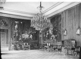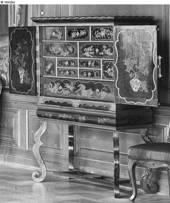 The cabinet is listed under “Französischer Galerie” in the inventory of Dresden Castle. According to the settlement agreement of 1924, ownership passed to the Free State of Saxony. From the 1930s, it was displayed in the Great Dining Room on the 2nd floor of the east wing. On the 1942 inventory, 1 lacquer cabinet was listed under “large dining room”. In August 1943, it was transported to a relocation site (presumably Rammenau or Schieritz). Nothing is known about the circumstances of the loss of this object. It is assumed that it was lost in connection with the events of the Second World War.