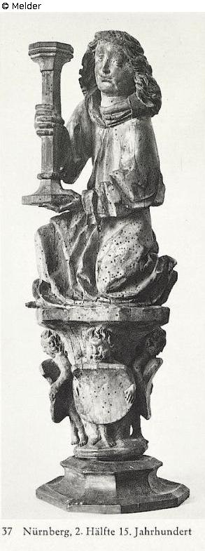 On a capital-alike pedastal with four putti holding an emblem an angel is kneeling with a wide, girt robe and wide collar. Curled hair. Candlesticks in the hands. Lime wood, full-round. Without coating. H. with pedastal 56 cm. (Hands and pedastal ände and Sockel added.) Source: Hugo Helbing Kunsthandlung and Kunstversteigerungshaus: Kunstbesitz eines Berliner Sammlers. Katalog Nr. 49.