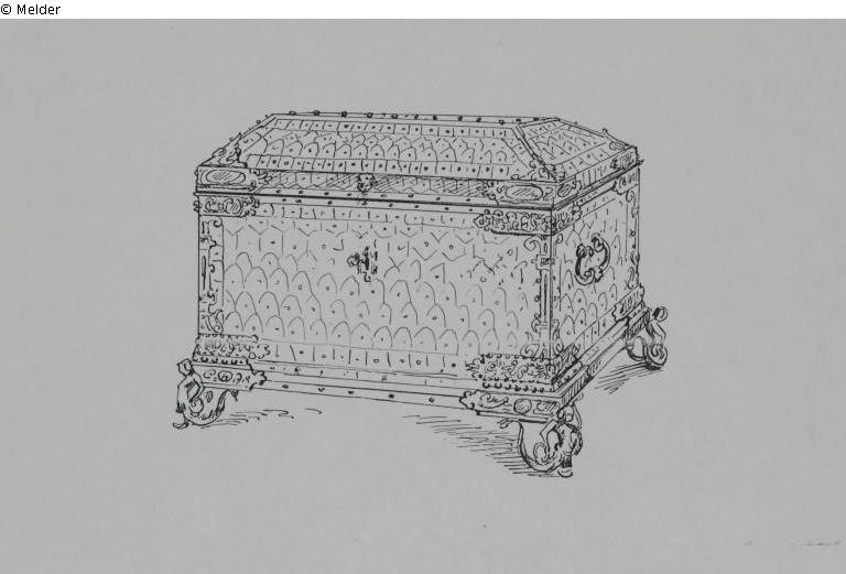 Inventar 1717, fol. 22r; Inventar 1764, fol. 18v, Nr. 86; Inventar 1830, fol. 7r, Nr. 154; Inventar 1858, Bd. 1, Kap. XXXV, Nr. 71; Aldenhoven Geräth und Schmuck, Goldschmiedsarbeit, Nr. 12; Zeichen-Inventar um 1900, Nr. 12