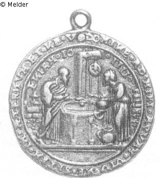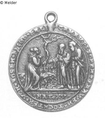 Medaille, gehenkelt, oben eine ausgefüllte Durchbohrung. Vs.: Rechts steht Christus, von einem bärtigen Jünger begleitet, und streckt die Arme der Kanaanäerin entgegen, die sich von links mit bittend erhobenen Händen nähert. Umschrift: CANANEISCHEN FRAWEN TOCHTER VON BOSEN FEIND ERL[ED] Im Abschnitt MAT XV (Interpunktion: Ringe). Rs.: Christus steht links an einem Ziehbrunnen und spricht mit der Samariterin, die mit ihren Krügen von rechts herangetreten ist. Umschrift: DOMINE AD MIHI AQVAM VIV NE SITAM IN ÆTERNVM ET NE V / ENIAM IO IIII (Interpunktion: Ringe).