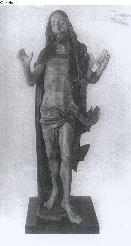 dressed only with a fluttering loincloth, standing upright, his left foot set forward, showing the wounds with raised hands. A cloth, loosely laid around the shoulders, behind - captures the figure. Crown of thorns and two toes of the right foot missing. Lime wood, full round