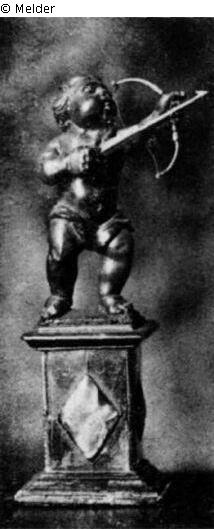 Cupid drawing his bow, on a square pedestal; bow and arrow (missing) made from brass; both wings are broken off.