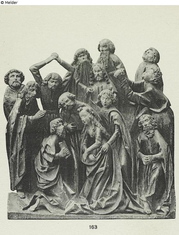 Relief group made of lime wood, the figures in front nearly full-round. Old colour coating (covered with gold). Group of 13 people next to each other and behind each other in steps. At the lower middle Saint John is helping Mary. She's bowed by her deficiency. Saint Peter is kneeling in front of her showing her the gospel. The rest of disciples in various restrained postures. Formerly: Collection Benoit Oppenheim. See: Original sculptures of wood etc. of Collection Benoit Oppenheim Berlin. Lpz. 1907, Tafel 14, Nr. 22. - Described in "Deutsche and Niederländische Holzbildwerke aus Berliner Privatbesitz" 1904, Tafel 37. Source: Hugo Helbing Kunsthandlung and Kunstversteigerungshaus: Kunstbesitz eines Berliner Sammlers. Katalog Nr. 49; Math. Lempertz'sche Kunstversteigerung: Eine bekannte Süddeutsche Privatsammlung and anderer Privatbesitz, Katalog Nr. 395.