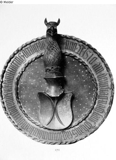 Holz geschnitzt und bemalt. Auf Sternengrund das Wappen, getielt durch zwei Halbmonde. Der Helm mit vollrundem Oberleib eines Greifen. Bandinschrift: Anno 1510 am Donrstag nach Sant Johanstag sunwenden starb der erber und vest Karol Vernicz der elter.