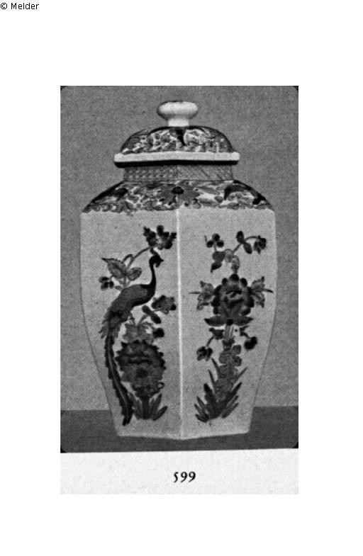 leicht gebaucht, sechskantig. Deckel, Schulter und Wandung mit Blumen und Vögeln in Blau, Rot, Grün, Violett und Schwarz in der Art der Imari-Ware bemalt. Reparatur am Hals. Meissen.