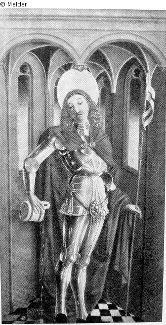In einer dreiseitigen gotischen Nische mit drei Fenstern, Rippengewölbe und Fliesenboden steht der Heilige in Ganzfigur, mit der gesenkten Rechten aus einem Holzzuber Wasser gießend, in der Linken eine Lanze mit Wimpel, in silberner Rüstung, über die ein purpurroter Mantel fällt und eine violette Schärpe mit goldener Agraffe geschlungen ist. Das Haupt vor goldenem Nimbus; zum gleichen Altar gehörige Flügel in der Münchener Pinakothek und im Museum zu Dijon.; Literatur: Abbildung Versteigerungskatalog Tafel 15, Publiziert in der Zeitschrift für Bildende Kunst, Januar 1931, Seite 70 und von W.Hugelshofer im Belvedere 1932; Jahrgang 11, Heft 3/4, Seite 14ff