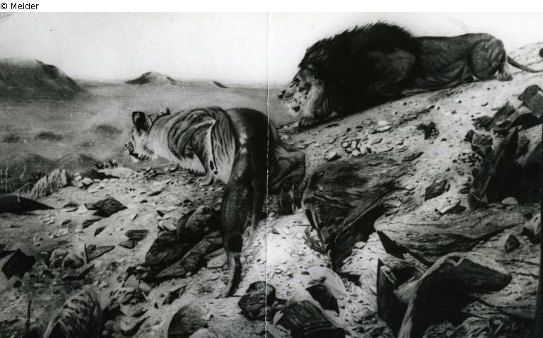 Signed lower right: Rich. Friese 84. Lower left the campfires of the resting caravan are smoking. In front, over the stony hill, an almost life-size pair of lions creeps lurking up. The lion is lying on his stomach, turned to the left, ready to jump. The lioness climbs up in the middle of the front with her neck stretched forward.