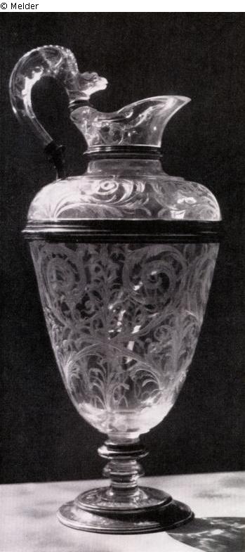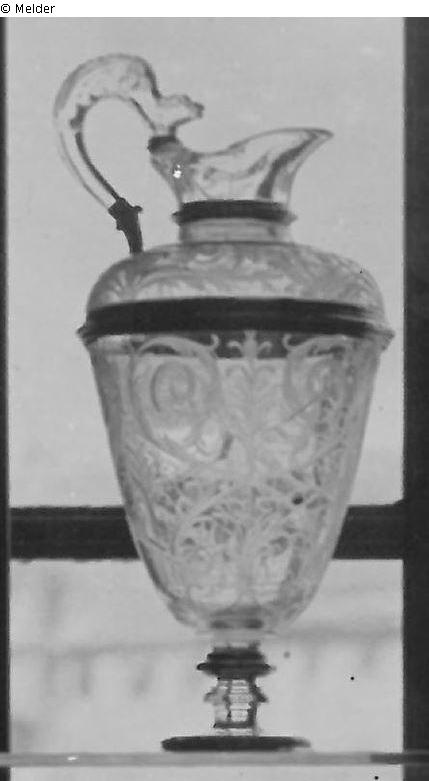 Tall, cup-shaped goblet with slender foot and cut arabesques; a low jug as the cover on top; a white-enamelled strip where the handle is attached; fitted with silver gilt at four places