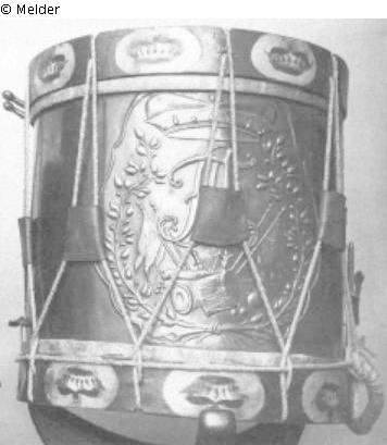 Kartusche mit dem getrieben Monogramm FA unter dem Kurhut und über Kriegstrophäen, von Lorbeerzweigen umrahmt. Die mit Tauen verspannten Reifen sind grün und zeigen in weißen Medaillons den Kurhut.