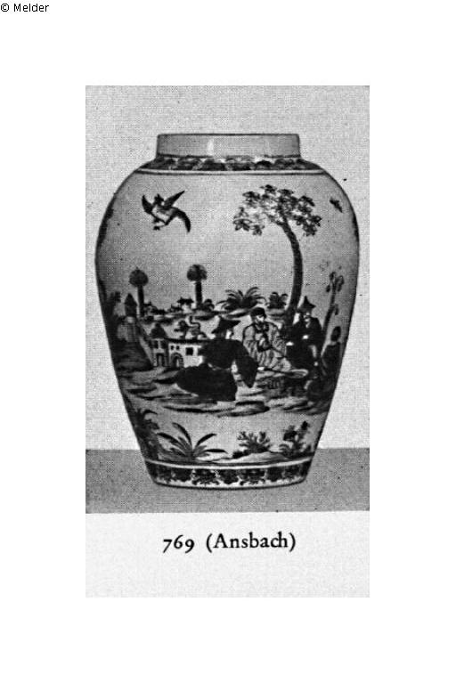 Auf weißem Grund in bunten Muffelfarben Landschaft mit chinesischen Gesellschaften und Tieren. Am unteren Ablauf und der Schulter Ornamentborte. Hals gekittet, blauer Sprung. Ansbach (Popp?)