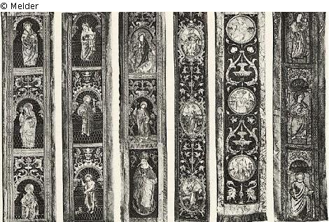 In farbiger Seide mit Gold und Silber auf Samt oder Brokatgrund: dargestellt in der Regel: Heilige mit ihren Attributen, Apostel, Marienfiguren oder Szenen aus der biblischen Geschichte. Die einzelnen Felder sind zusammengestellt zu Pfeiler- und Vertäfelungsbehängen, Tür -und Fensterumrahmungen und dergleichen und haben eine Größe von 40 x 19 cm; sie sind sämtlich mit alter Goldborte gerahmt.