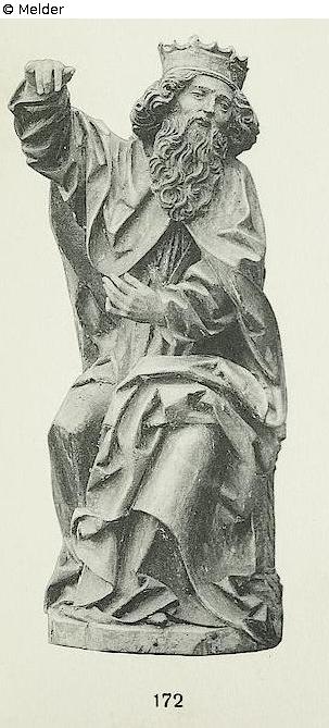 (Belongs to a group of a coronation of Mary). Lime wood, hollowed at backside, old, sometimes painted over coating. Full-bearded head with low jagged crown. The garmlet girt, the overcoat at shoulders and lower body draped in much drapes. The right arm is raised up for a blessing gesture. Source: Hugo Helbing Kunsthandlung and Kunstversteigerungshaus: Kunstbesitz eines Berliner Sammlers. Katalog Nr. 49; Math. Lempertz'sche Kunstversteigerung: Eine bekannte Süddeutsche Privatsammlung and anderer Privatbesitz, Katalog Nr. 395.
