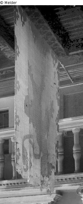 Große weißseidene Viertelfahne mit eingenähtem gelben Löwen. Wegen Beschädigung durch Seide geschützt.
