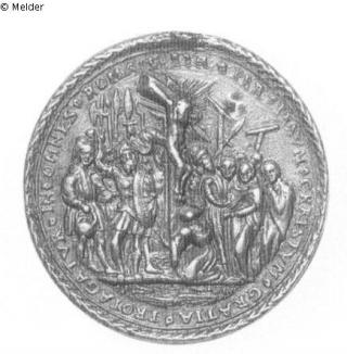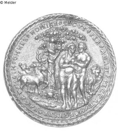 Medaille, der ursprüngliche Henkel ist entfernt worden. Vs.: Adam und Eva stehen rechts vor dem Baum der Erkenntnis, um dessen Stamm sich die Schlange windet. Links sieht man einen Hirsch und ein Reh. Umschrift: SICVT PER ADAM PECCATVM EST PROPAGATVM IN OMNES HOMINE (Interpunktion: Rhomben). Rs.: In der Mitte erhebt sich das Kreuz Christi, und Maria Magdalena kniet am Fuß des Kreuzes. Rechts sieht man eine Gruppe mit Maria und Johannes, links Kriegsvolk mit Lanzen und Hellebarden. Umschrift: ITA PER IESVM CHRISTVM GRATIA PROPAGATVR IN OMNES ROMA 5 (Interpunktion: Rhomben). Beidseitig ringsum ein Blattkranz.