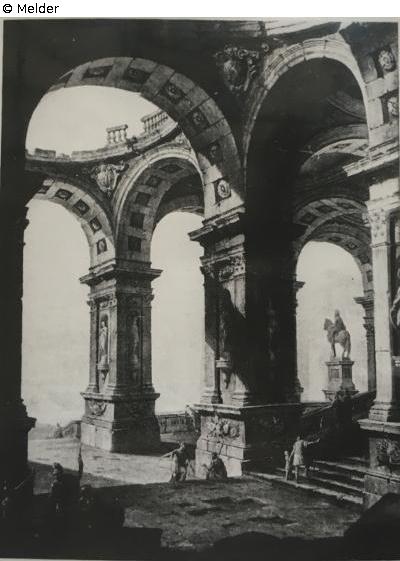The painting represents a hardly identifiable building (probably a Roman building in Rome or a fictitious Roman temple), which consists of high vaults with Rossett decoration and buttresses. At the bottom of the picture are a group of soldiers. In the background a rider statue can be seen.
