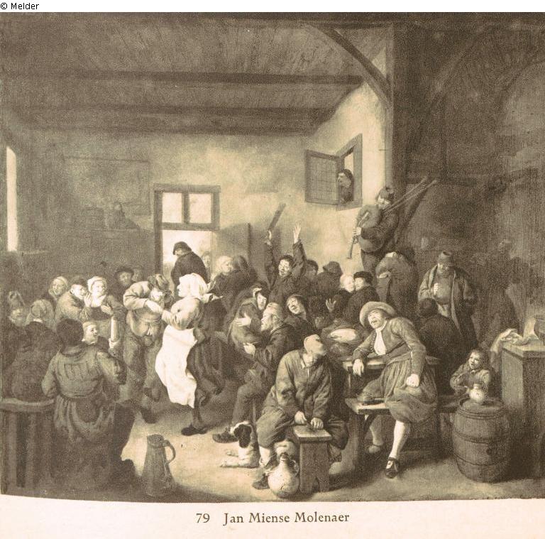 In a spacious tavern groups of men and women are sitting densly in rounds at tables, drinking and laughing. In the center a couple is dancing to the music of a backpipe player, who's standing at the right, heightened a bit. In the background an open door with view to the outside. Right, at the edge of the table signed: Mensen Molenaer. Old golden frame. At backside a seal with blurred emblemn. Source: Hugo Helbing Kunsthandlung and Kunstversteigerungshaus: Kunstbesitz eines Berliner Sammlers. Katalog Nr. 49.