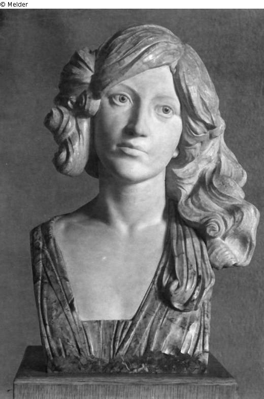 The head is slightly sloped towards the left shoulder, the very full, parted hair is taken together, on the left the hair falls down over the shoulder on which also the end of the folded jacket lies.