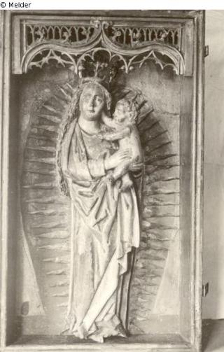 Maße - Schrein: 108 x 62,5; rechter Flügel: 108 x 31,2. Der linke Flügel und die Marienfigur sind nur erhalten. Rechter Flügel als Kriegsverlust: Oben der Hl. Mauritius in Rüstung und Mantel mit der Fahne in der rechten Hand; Rüstung golden, Oberteil grün; Mantel golden, blau gefüttert; Schuhe rot. Unten die Hl. Barbara mit Kelch; Untergewand grün, Mantel golden, blau gefüttert.