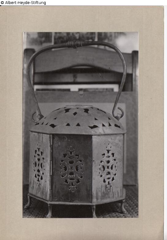 Mobile furnace made of openwork brass sheet. Octagonal shape with eight feet. A movable mounted, iron bracket handle on the convex lid.