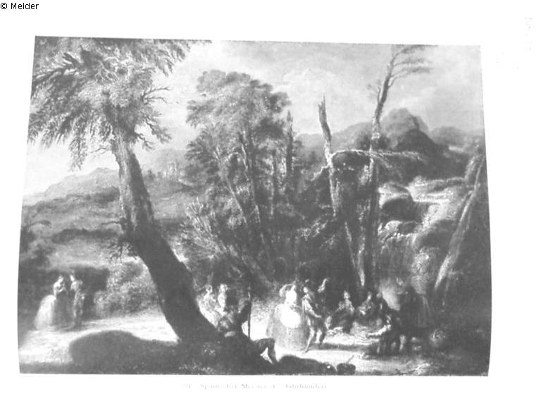 Im Vordergrund am Fuße eines hohen Baumes ein sitzender Herr mit einem Stab in der Hand. Rechts lagernde musizierende Gesellschaft von Herren und Damen beim Mahle, in der Mitte ein tanzendes Paar. Daneben zwei stehende Frauen und links ein Kavalier, der einer Dame eine Blume überreicht. Im Mittelgrunde mehrere Bäume, rechts ein Wasserfall. Bewaldete bergige Ferne mit Ruinen. Goldener Rahmen. Gutachten: Bode ("...echtes, sehr tüchtiges Werk...das dem Velasquez sehr nahe steht. Es ist sehr gut erhalten.") Aus polnischem Besitz.