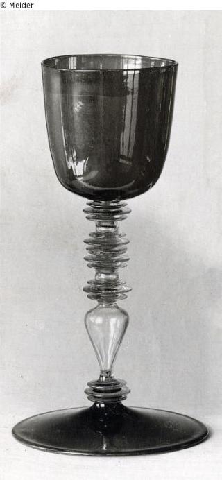 Green and white glass. Without cover. Green glass foot and goblet, white glass foot consisting of discs and an oval bubble. Shape of a Nuremberg piece, baluster stem repaired, one sphere lost.