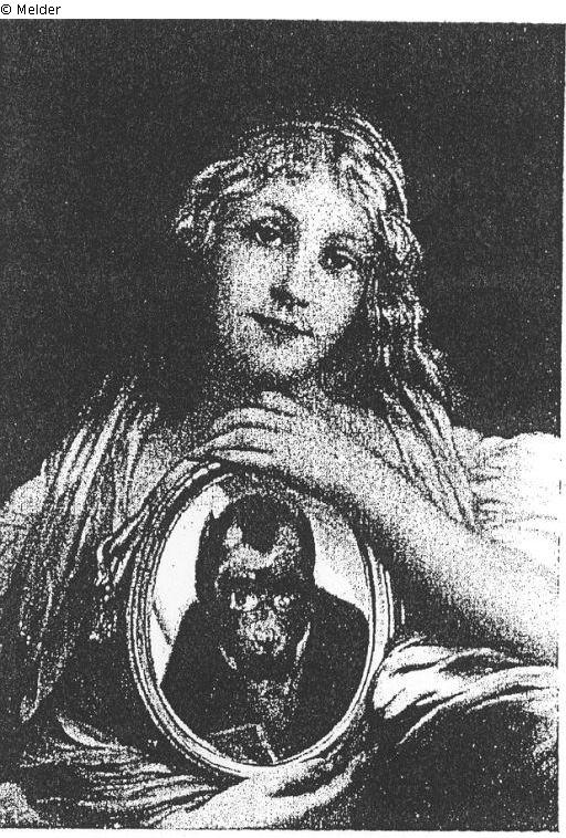 a young blond girl in a pink dress holding an oval gold frame with a monkey portrait; signed