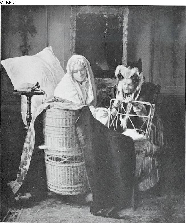 An interior scene with a grandmother and a mother looking into a cradle. Inscribed on the reverse by the artist, dated 6 January 1871