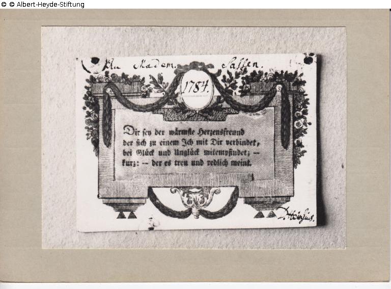 Colored engraving depicting a wreathed plaque with a four-line congratulatory inscription: “Dir sey der wärmste Herzensfreund / Der sich zu einem Ich mir Dir verbindet, / bei Glück und Unglück mitempfindet; - / kurz: - der es treu und redlich meint.” Above oval cartouche with entry "1784". Also addressed in handwriting "An Madem. Sassen" and signed: "D. Heinsius".