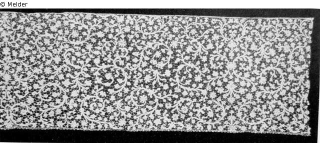 Genäht mit Reliefwirkung, symmetrisch entwickelte Blumenranken mit Stegverbindung. Am Rand Zackenstäbe.