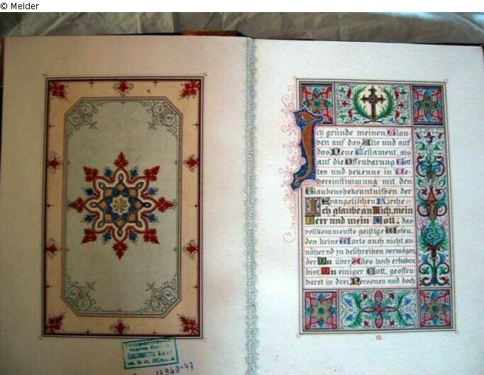 angefertigt in Karlsruhe 1856 von I. Lorenz; mit dekorativem Einband versehen (Silber, vergoldet)