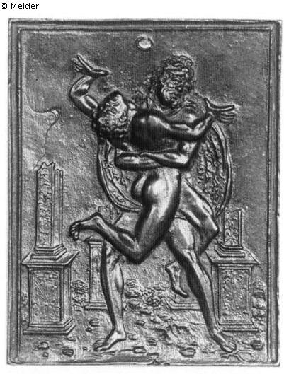 Rechteckige Plakette, schmales Rahmenprofil, oben in der Mitte eine Durchbohrung. Herkules im Löwenfell hat den Antäus vom Boden gehoben und erdrückt den sich im Todeskampf windenden Körper. Rechts und links hinter den Figuren sieht man zart ornamentierte Pfeilerstümpfe. Die Varianten der Plakette in der Berliner Skulpturensammlung (Bange 1922, Nr. 476) und in der Kress Collection in Washington zeigen oben Kreuzgewölbe, nach Pope-Hennessy handelt es sich um spätere Güsse. Auf den Exemplaren der ehemaligen Slg. Ritleng und der Auktion Adams IV, Nr. 69, erscheint rechts ein Baumstumpf mit einem neuen Trieb. Im Museo Nazionale del Bargello in Florenz und in den Musei Civici von Brescia befinden sich größere runde Stücke von einem jüngeren Nachahmer, auf denen links ein antikes Bauwerk hinzugefügt ist. Die Szene wurde auch an der Fassade des Doms zu Como in Stein umgesetzt.