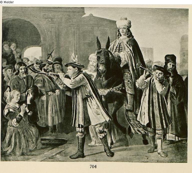The biblical scene depicted in the painting refers to the so-called Old Testament: Book of Esther 6:7-11. The Jew Mordecai is dressed in royal garments and headdress, ridden on a horse, led through the streets and honoured.