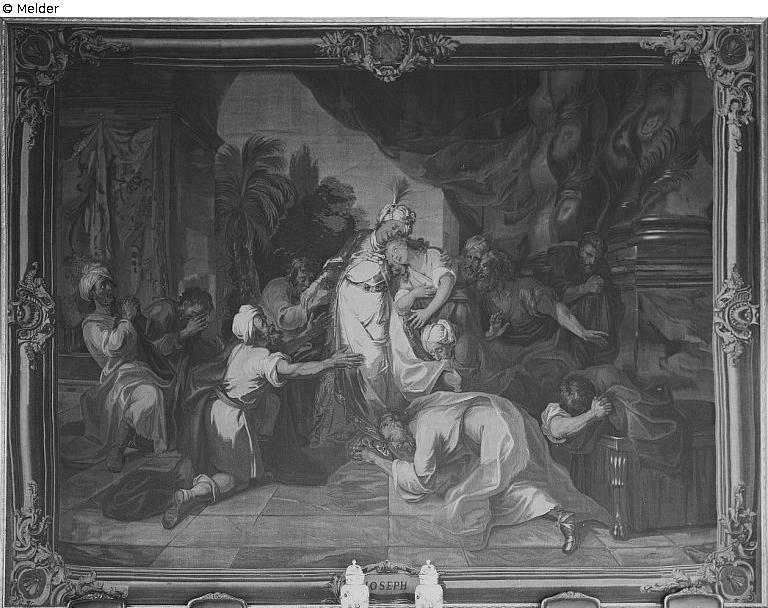 The narrative refers to Genesis chapter 45, 1-4, the moment when Joseph is recognised by his brothers. Joseph stands in the centre of the composition in a white robe. According to Egyptian tradition, his head is covered by a turban with an eagle. He presses Benjamin to his chest, while his other brothers kneel around him, kiss the hem of his robe or raise their hands to him in supplication. The encounter takes place in a hall flanked by sinuous, Solomonic columns. In the background, the room opens out onto a landscape with a palm tree. In each of the four corners is a cartouche with a bee, Napoleon's heraldic animal. Signature in the lower right field: ‘Neilson . Ex . 1787’