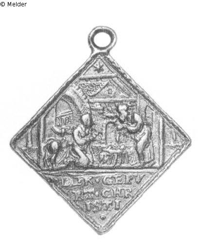 Rhombenförmiger Anhänger. Vs.: Dem schlafenden Joseph erscheint im Traum ein Engel. Im Abschnitt die Inschrift EVANGELI / S MATH / I / ?Rs.: In der zerfallenen Hütte beugt sich Joseph von rechts über das Kind, das in der Krippe liegt. Links kniet Maria, und hinter ihr sieht man den Esel. Im Abschnitt die Inschrift DER GEPV / RT CHR / ISTI /